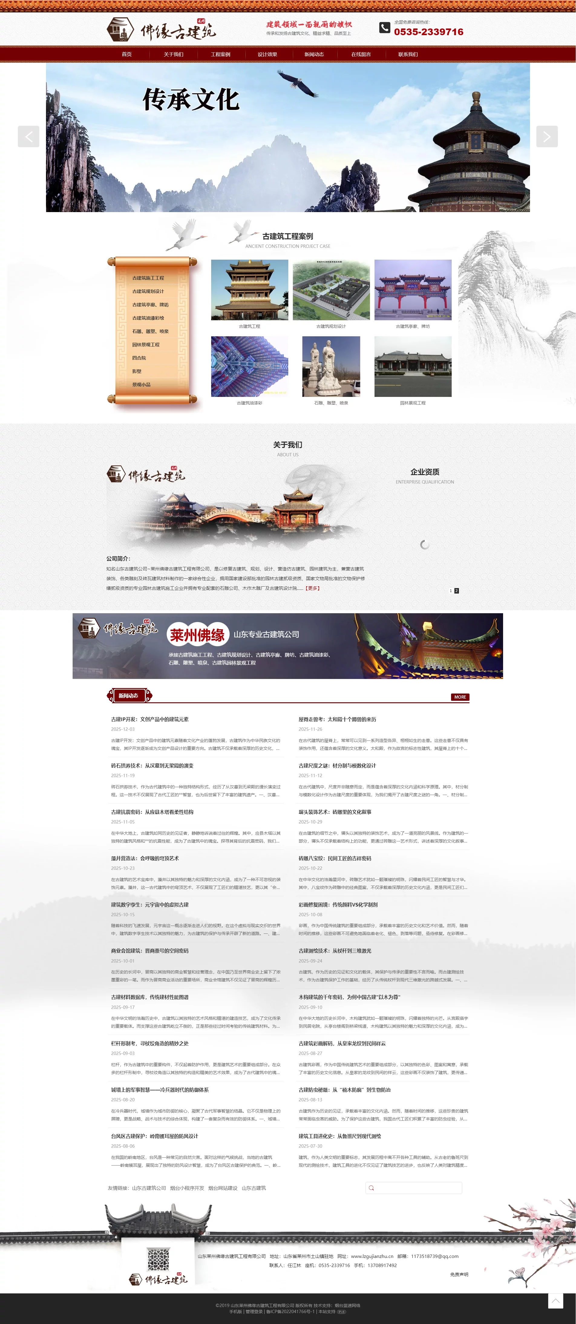 莱州佛缘古建筑工程有限公司,是以修复古建筑、规划、设计、营造仿古建筑、园林建筑为主,兼营古建筑装饰、各类雕刻及砖瓦建筑材料制作的一家综合性企业,拥用国家建设部批准的园林古建贰级资质、国家文物局批准的文物保护修缮贰级资质的专业园林古建筑施工企业并拥有专业配套的石雕公司、木作木雕厂及古建筑设计院。