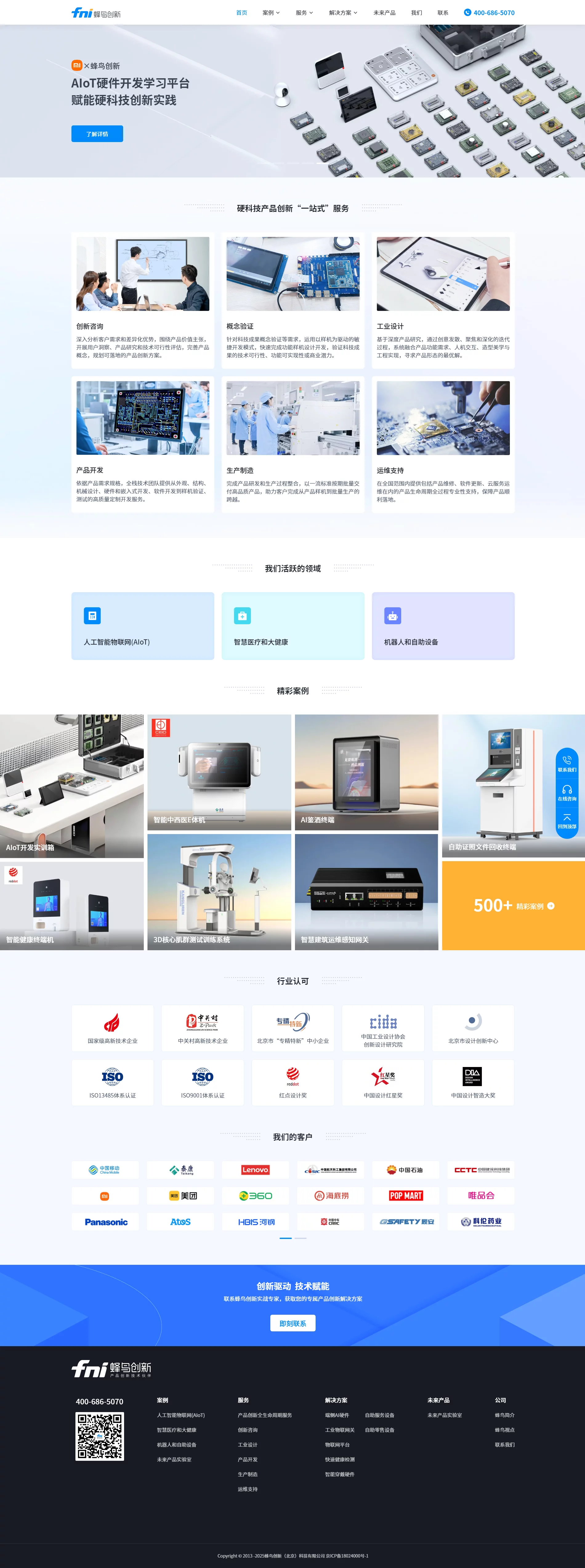 多年来,蜂鸟创新始终将 “助力客户打造革命性产品,实现商业价值”作为核心使命,持续完善创新方法论、不断提升交付能力,为行业客户提供可靠、高效、持续的技术服务。目前,我们已累计为数百家世界五百强企业、“专精特新”企业、高校和科研院所等客户提供了深度服务,业务涵盖人工智能物联网(AIoT)、智慧医疗和大健康、机器人和自助设备等领域。